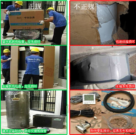 非專業(yè)安裝,讓你可能面臨:樓房裝修破壞,無限的高強(qiáng)度噪音,一系列安全隱患……只有通過專業(yè)的空調(diào)安裝,你的安全才能得到保障,才能真正享受中央空調(diào)帶來的舒適感受。 1、拆包檢查